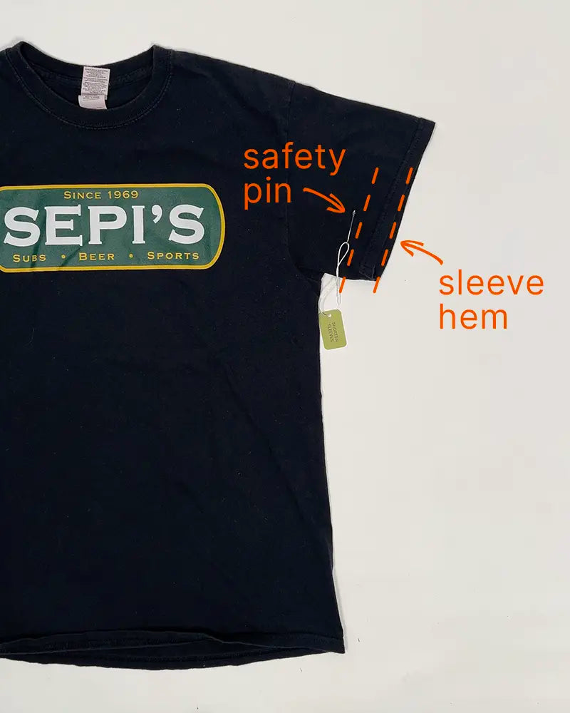 Place the safety pin parallel to your existing sleeve hem at the length you decided in the previous step. The safety pin should be placed somewhere between the sleeve hem and the sleeve seam.