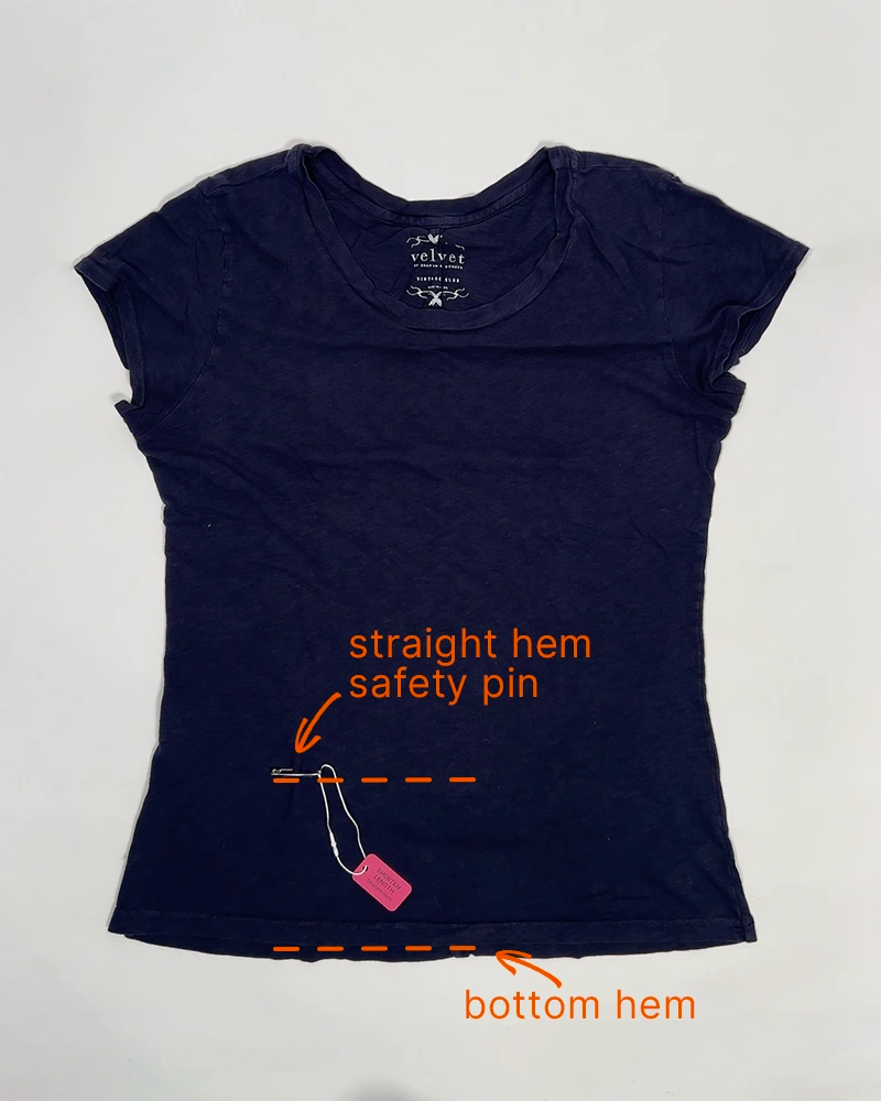 Place the safety pin parallel to the existing bottom hem.